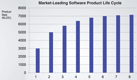 图 1.4 展示了系统开发者的切身体会。他们一开始的效率都接近 100%,然而伴随着每次产品的发布,他们的生产力直线下降。到了产品的第 4 版本时,很明显大家的生产力已经不可避免地趋近为零了。