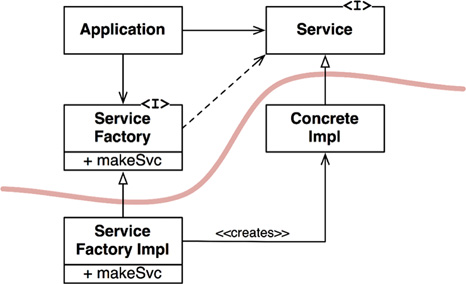 The diagram in Figure 11.1 shows the structure. The Application uses the ConcreteImpl through the Service interface. However, the Application must somehow create instances of the ConcreteImpl. To achieve this without creating a source code dependency on the ConcreteImpl, the Application calls the makeSvc method of the ServiceFactory interface. This method is implemented by the ServiceFactoryImpl class, which derives from ServiceFactory. That implementation instantiates the ConcreteImpl and returns it as a Service.