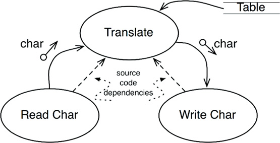 The data flow diagram in Figure 19.1 depicts a simple encryption program that reads characters from an input device, translates the characters using a table, and then writes the translated characters to an output device. The data flows are shown as curved solid arrows. The properly designed source code dependencies are shown as straight dashed lines.