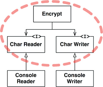 A better architecture for this system is shown in the class diagram in Figure 19.2. Note the dashed border surrounding the Encrypt class, and the CharWriter and CharReader interfaces. All dependencies crossing that border point inward. This unit is the highest-level element in the system.