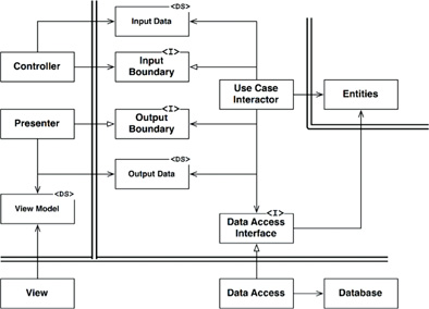 At the lower right of the diagram in Figure 22.1 is an example of how we cross the circle boundaries. It shows the controllers and presenters communicating with the use cases in the next layer. Note the flow of control: It begins in the controller, moves through the use case, and then winds up executing in the presenter. Note also the source code dependencies: Each points inward toward the use cases.