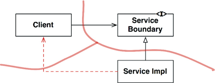 It should be clear that this sets the stage for a future architectural boundary. The necessary dependency inversion is in place in an attempt to isolate the Client from the ServiceImpl. It should also be clear that the separation can degrade pretty rapidly, as shown by the nasty dotted arrow in the diagram. Without reciprocal interfaces, nothing prevents this kind of backchannel other than the diligence and discipline of the developers and architects.