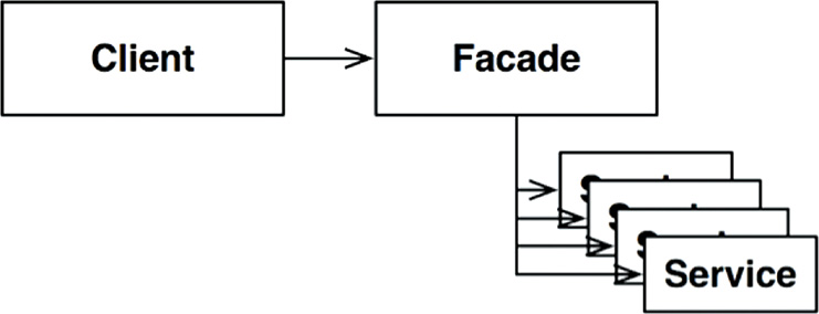 An even simpler boundary is the Facade pattern, illustrated in Figure 24.2. In this case, even the dependency inversion is sacrificed. The boundary is simply defined by the Facade class, which lists all the services as methods, and deploys the service calls to classes that the client is not supposed to access.