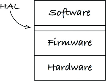 The software accesses the services of the operating environment through the OS. The OS is a layer separating the software from firmware (Figure 29.5). Using an OS directly can cause problems. For example, what if your RTOS supplier is bought by another company and the royalties go up, or the quality goes down? What if your needs change and your RTOS does not have the capabilities that you now require? You’ll have to change lots of code. These won’t just be simple syntactical changes due to the new OS’s API, but will likely have to adapt semantically to the new OS’s different capabilities and primitives.