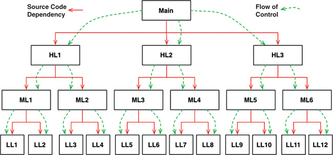 我们可以想象一下在安全和便利的多态支持出现之前,软件是什么样子的。下面有一个典型的调用树的例子,main 函数调用了一些高层函数,这些高层函数又调用了一些中层函数,这些中层函数又继续调用了一些底层函数。在这里,源代码面的依赖不可避免地要跟随程序的控制流(详见图 5.1)。
