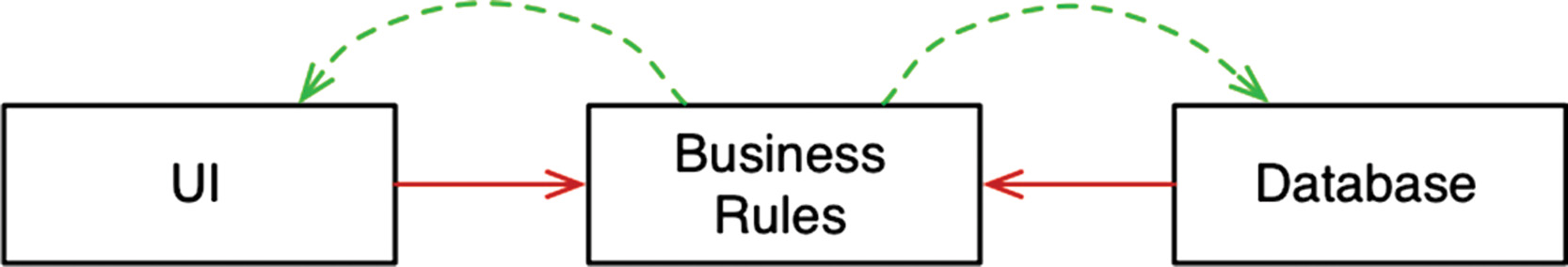 这种能力有什么用呢?在下面的例子中,我们可以用它来让数据库模块和用户界面模块都依赖于业务逻辑模块(见图 5.3),而非相反。