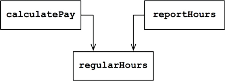 For example, suppose that the calculatePay() function and the reportHours() function share a common algorithm for calculating non-overtime hours. Suppose also that the developers, who are careful not to duplicate code, put that algorithm into a function named regularHours() (Figure 7.2).