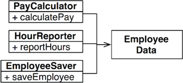 Perhaps the most obvious way to solve the problem is to separate the data from the functions. The three classes share access to EmployeeData, which is a simple data structure with no methods (Figure 7.3). Each class holds only the source code necessary for its particular function. The three classes are not allowed to know about each other. Thus any accidental duplication is avoided.