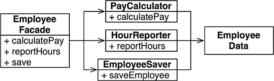 Some developers prefer to keep the most important business rules closer to the data. This can be done by keeping the most important method in the original Employee class and then using that class as a Facade for the lesser functions (Figure 7.5).