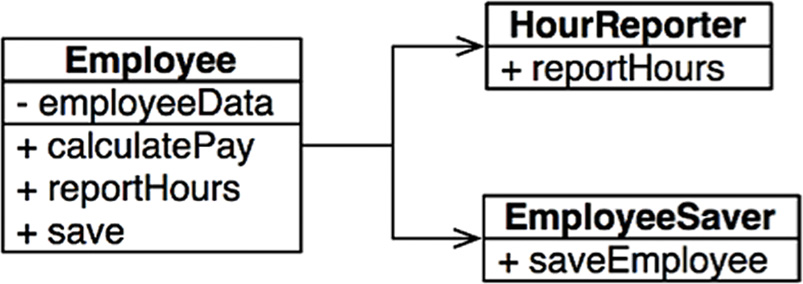 这是我最喜欢举的一个例子:某个工资管理程序中的 Employee 类有三个函数 calculatePay()、reportHours() 和 save()(见图 7.1)。