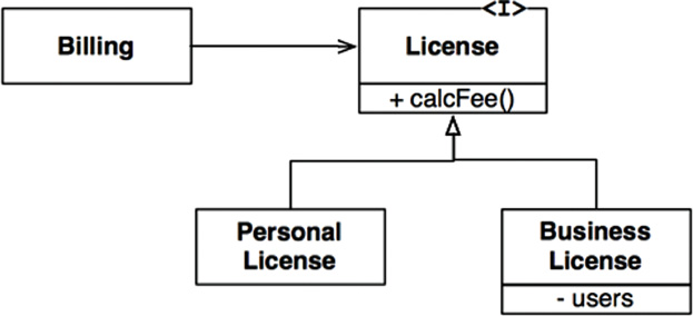 Imagine that we have a class named License, as shown in Figure 9.1. This class has a method named calcFee(), which is called by the Billing application. There are two “subtypes” of License: PersonalLicense and BusinessLicense. They use different algorithms to calculate the license fee.