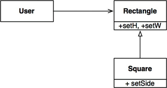 在这个案例中,Square 类并不是 Rectangle 类的子类型,因为 Rectangle 类的高和宽可以分别修改,而 Square 类的高和宽则必须一同修改。由于 User 类 始终认为自己在操作 Rectangle 类,因此会带来一些混淆。例如在下面的代码中: